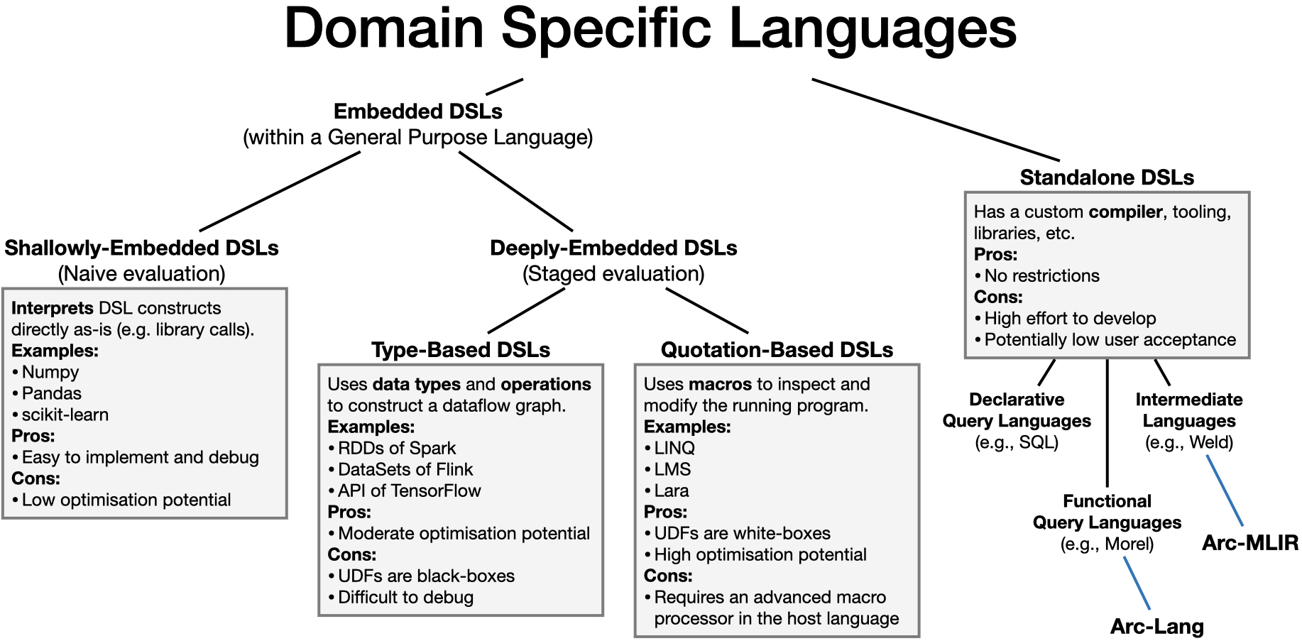 To cope with the requirements of batch and stream data management, a runtime system is needed which can exploit distributed programming to enable scalability through partitioning and parallelism. Distributed programming is however difficult without abstraction. Application developers must manage problems such as fault tolerance, exactly-once-processing, and coordination while considering tradeoffs in security and efficiency. To this end, distributed systems leverage high-level DSLs which are more friendly towards end-users. DSLs in the form of query languages, frameworks, and libraries allow application developers to focus on domain-specific problems, such as the development of algorithms, and to disregard engineering-related issues. In addition, DSLs that are intermediate languages have been adopted by multiple systems both as a solution to enable reuse by breaking the dependence between the user and runtime, and to enable target-independent optimisation. There is always a tradeoff that must be faced in DSL design. DSLs make some problems easier to solve at the expense of making other problems harder to solve. How a DSL is implemented can also have an impact on its ability to solve problems. DSLs can be categorized as follows:
